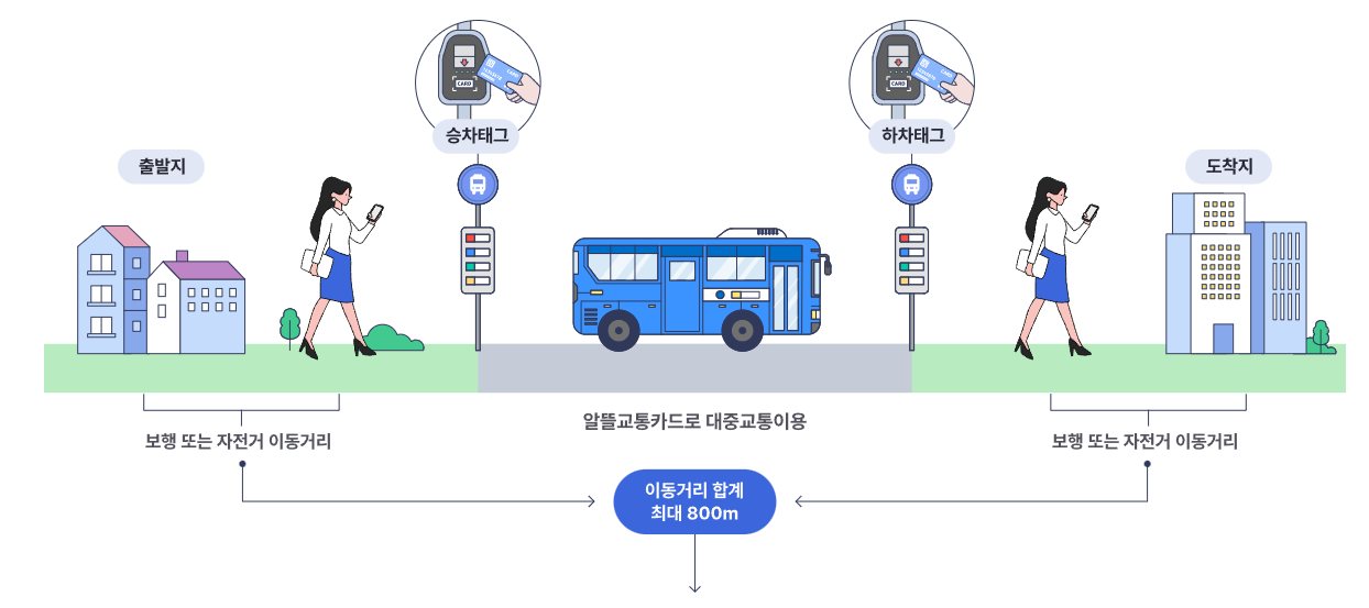 알뜰교통카드 사용법은 대중교통 이용할 때 출발지에서 승차점까지 이동거리, 하차점에서 도착지의 이동거리의 합으로 마일리지를 적립할 수 있습니다.