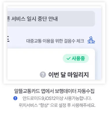 이때 등록되지 않은 정류장 이용 시 이동거리는 적립되지 않을 수 있습니다. 대중교통 1회 이용 시 이동거리 최대 800m까지 인정되며 월 15회 미만 이용 시 적립액은 소멸됩니다.