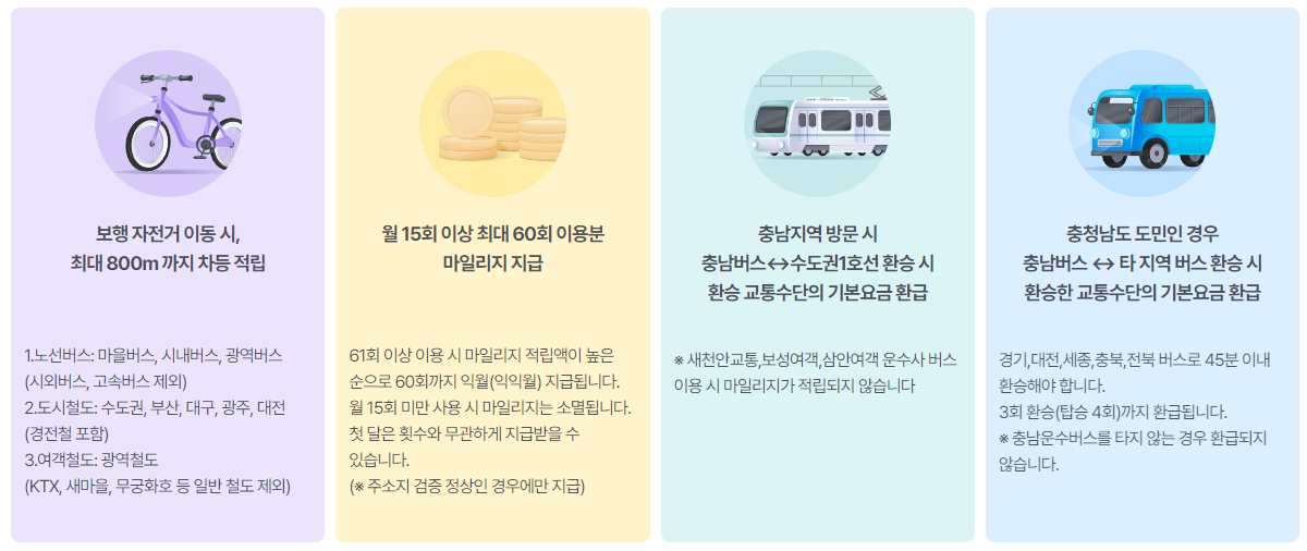 추가적으로 충남지역 방문 시 충남운수사 환승요금은 마일리지로 적립되며 충남도민일 경우 추가 환승혜택을 받을 수 있으니 참고하시길 바랍니다.